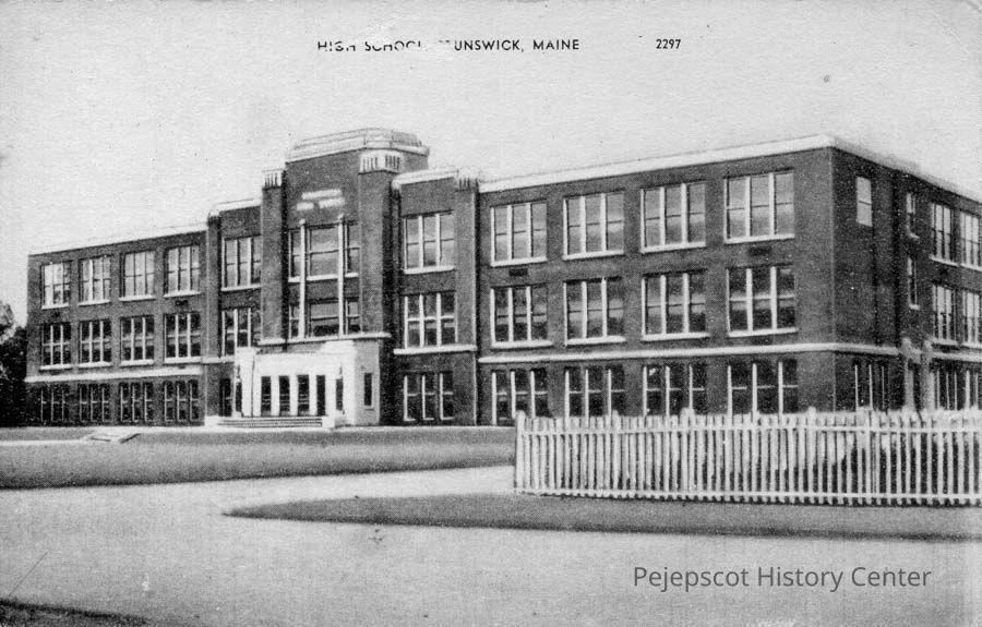 A black and white postcard of Brunswick High School, 38 Spring Street, Brunswick, Maine. Undated.