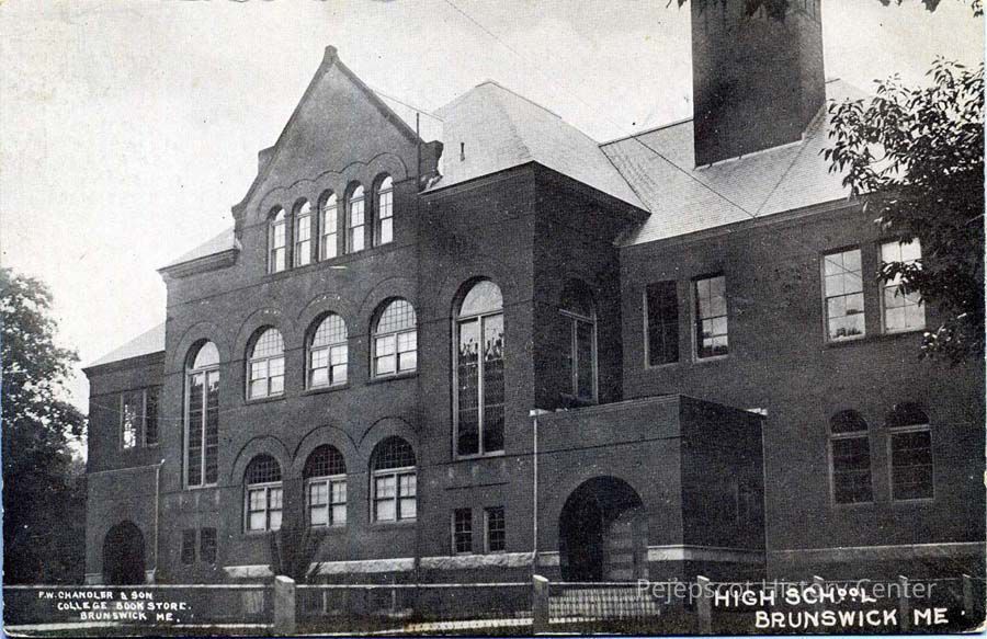 B/W postcard of Brunswick High School on the corner of Federal and Green Streets.