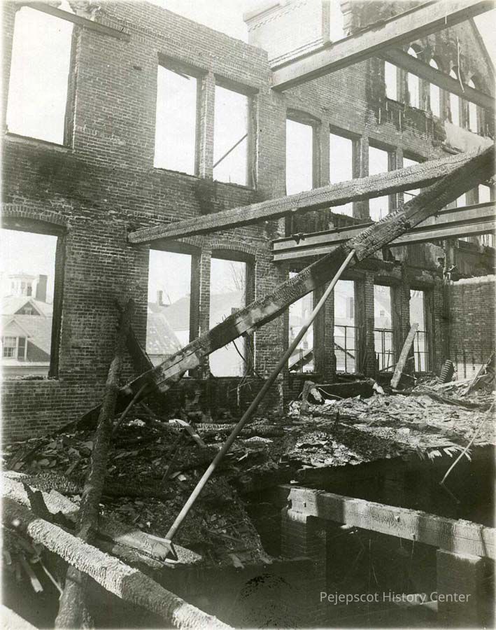 A black and white photo of the ruins of the former Brunswick High School, now Hawthorne School, at the corner of Federal and Green Streets. Brunswick, Maine. Undated.