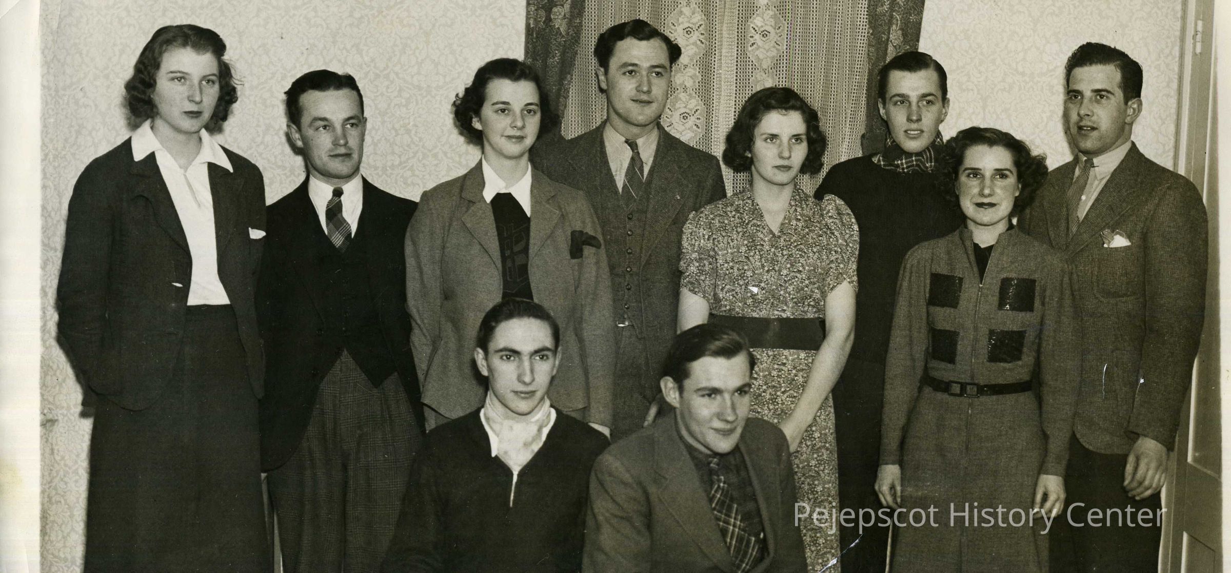 B/W photo of of several people at a Brunswick High School Alumni Dinner committee meeting. Inscribed on the back: "Lucille Jackson; Lionel Caron; Anita Dionne; Russell Brillant; Yvette Pickard; Bob Pletts; Helen Racine; Arthur Warren; front, Omer McDuff and Harold Pletts". The photo was taken at Helen Racine's in Brunswick, ca. 1938.
