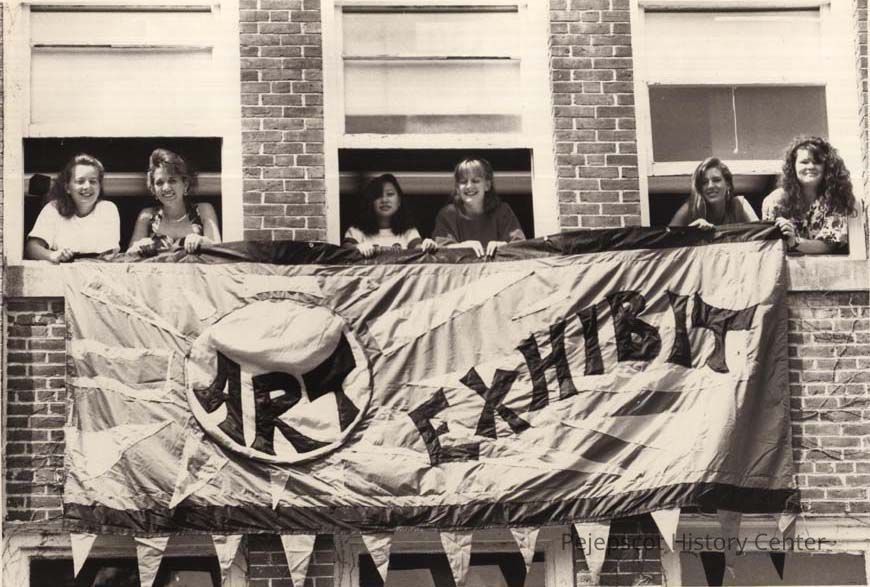 A black and white photograph of students advertising the Brunswick High School Art Show, Brunswick, Maine. Six students are holding a crafted banner announcing the art exhibit from the second floor of the High School. This photo was published in the Times Record newspaper on 06/08/1992.