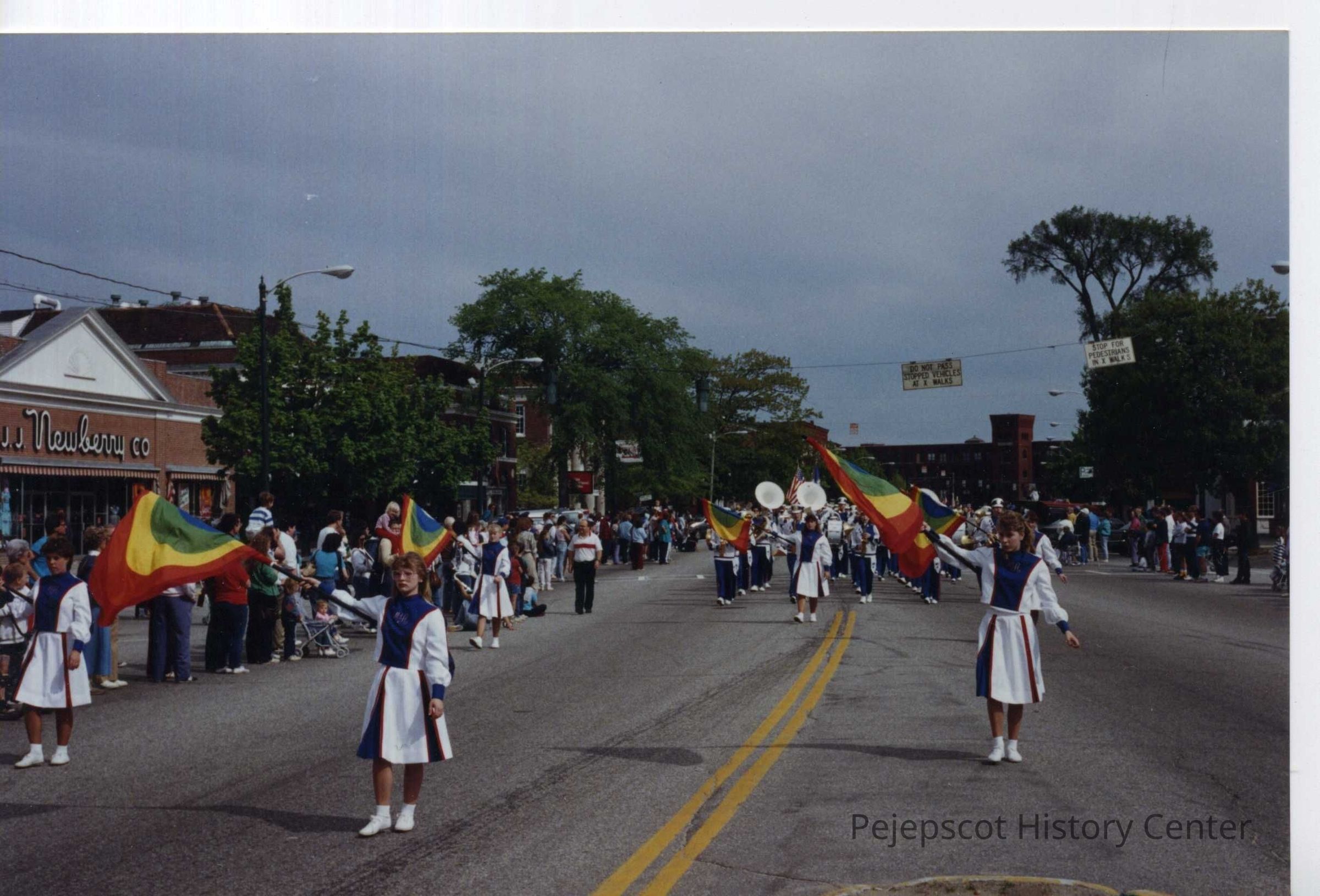 A color photograph of the Brunswick High School Band marching down Maine Street in Brunswick at the Desert Storm Welcome Home parade.
