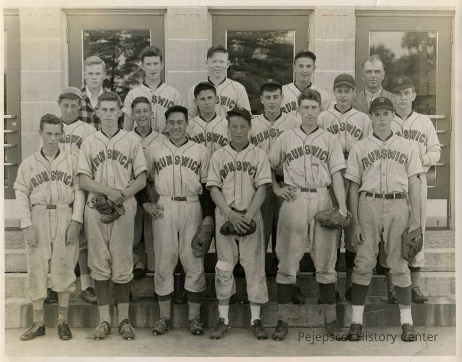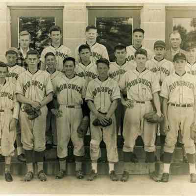 A photo of the Brunswick High School baseball team c. 1945. Identified on photo and comments about some of the players.