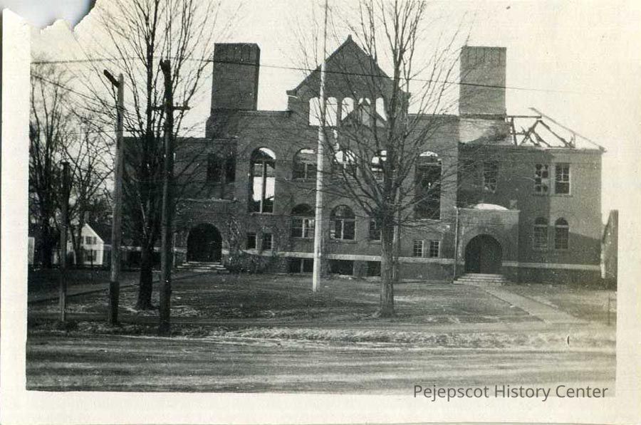 A black and white photo of the Brunswick High School building on the corner of Federal and Green Streets after it was heavily damaged by fire in 1915. The building--the second high school buidling located on the site--was later rebuilt.