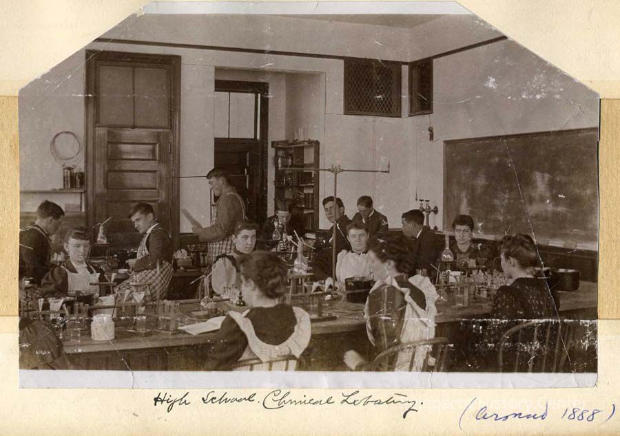 A B/W photo of students in the Brunswick High School Chemistry Laboratory, Brunswick, ME. Dated 1888.