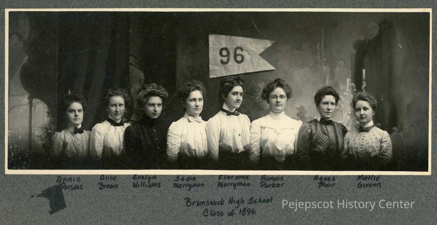 A mounted black and white photograph of the Brunswick High School class of 1896, made up of 8 girls. From left to right: Annie Parsons, Alice Brown, Evelyn Williams, Sadie Merryman, Florence Merryman, Frances S. Parker, Agnes Muir, and Mollie Giveen. The girls are shown from the waist up, and are in order of height with the tallest in the middle and the shortest on the two sides. Behind them on the wall is a pennant that says 96. Undated.Lexicon