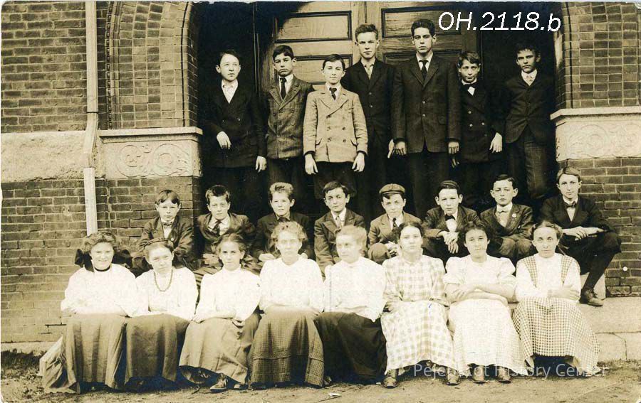 A B/W photograph of Brunswick High School Class of 1909 sitting on the steps of old high school at the corner of Federal and Green Street, Brunswick, ME. Dated 1909.