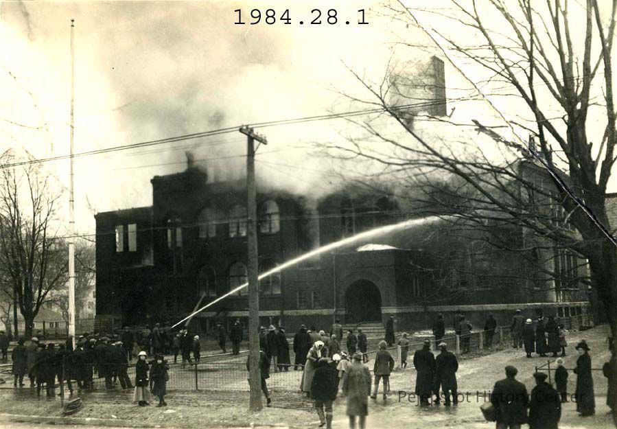 A B/W photograph of the fire that destroyed the Brunswick High school building, located on Federal Street, Brunswick, ME. The building was reconstructed. After serving as a high schoo,l the building served as an elementary school into the 2000's. It now serves as the Town of Brunswick School Department. Dated 01/1915.