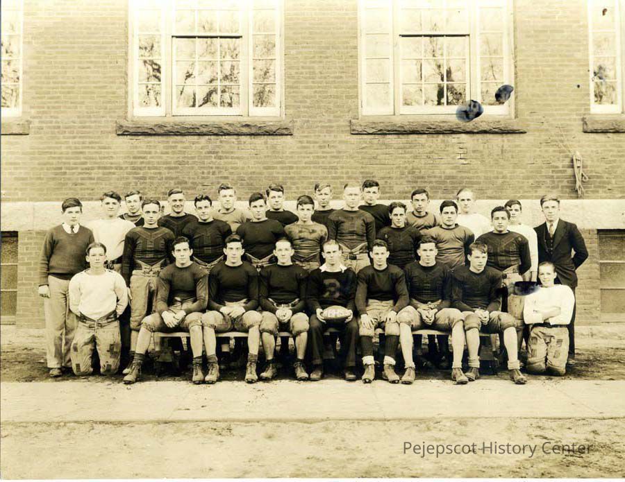 A photo of a Brunswick High School football team. 193?. Some say they can see a 2 on the end of the football. The writer can't.