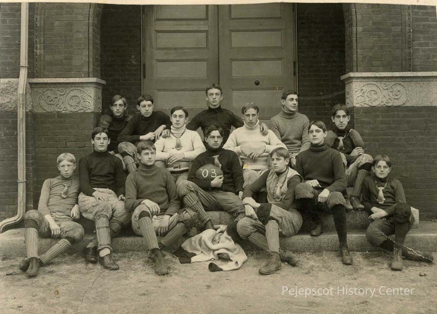 A B/W photograph view of Brunswick High School Football team outside of the school in Brunswick, ME.