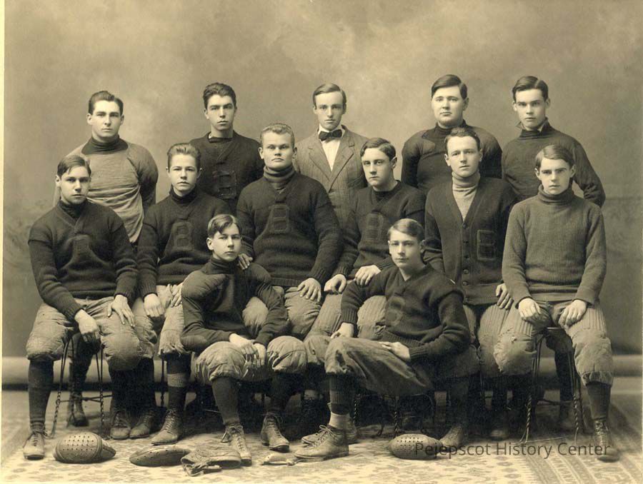 A black and white photo of the Brunswick High School 1910 football team in a block wooden frame. Brunswick, Maine.