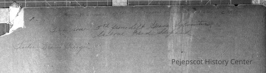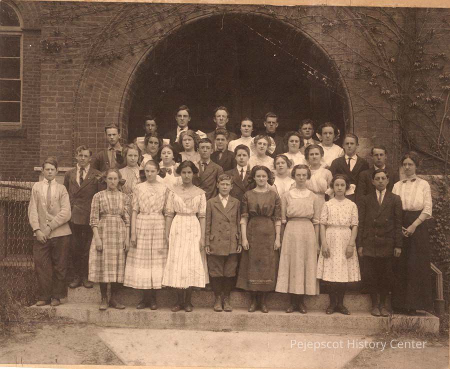 A B/W photograph of a graduating class from Brunswick High School. c 1915? 3rd row - 5th girl is Grace Sylvester and the boy on the end is Fred E. Shephard. Photo circa 1908.