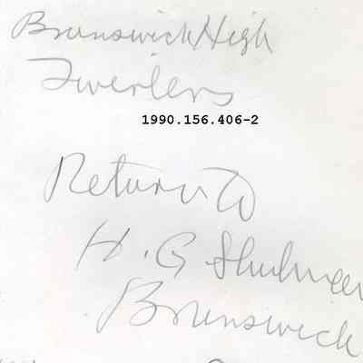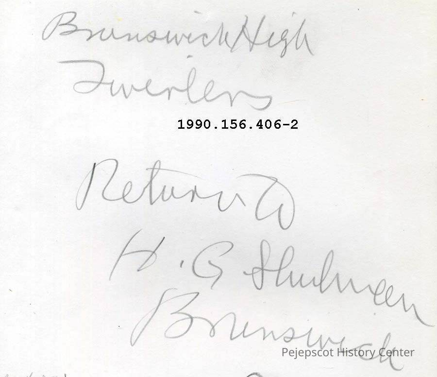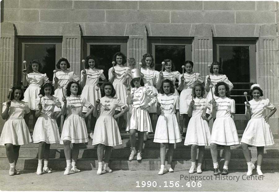 A B/W photograph of a group of Brunswick High School Twirlers. Photo was taken in front of the school. c. 1940s - 1950s. No names given. Undated