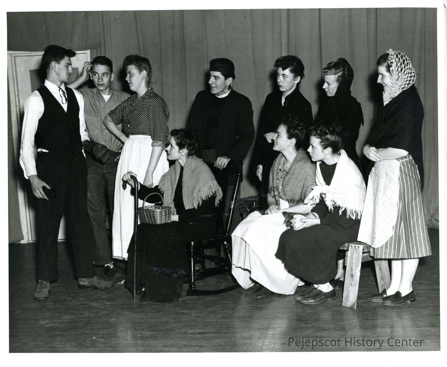 The cast in the Brunswick High School Play of 1947, "A Husband for Breakfast." Standing are 1.) ?, 2.) Jim Bleau, 3.) ? 4.) Roland Bouchard, 5.) Chantel Thibeault, 6.) ?, 7.) Barbara Skolfield. Seated are Evelyn (Lorraine) Gamache, Doris Pelletier, and ?. According to the Orange and Black yearbook the following people are in the picture but not placed: Irene Champion, Mona Longfellow, Arlene Pennell, and Fernando Langlais. UndatedLexicon