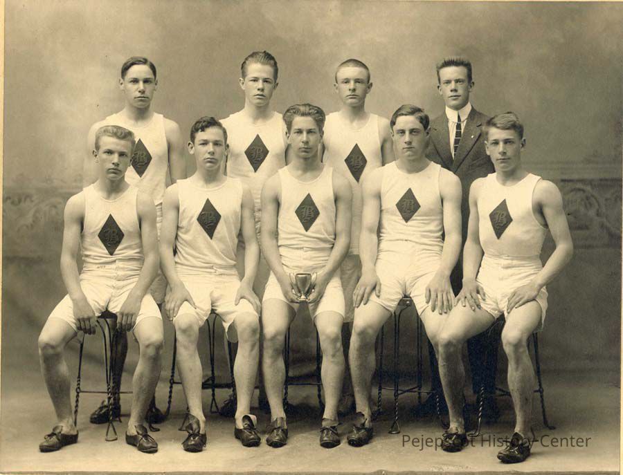 A black and white photo of the 1910-1911 Brunswick High School relay team in a block wooden frame. Brunswick, Maine.