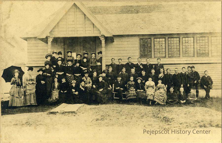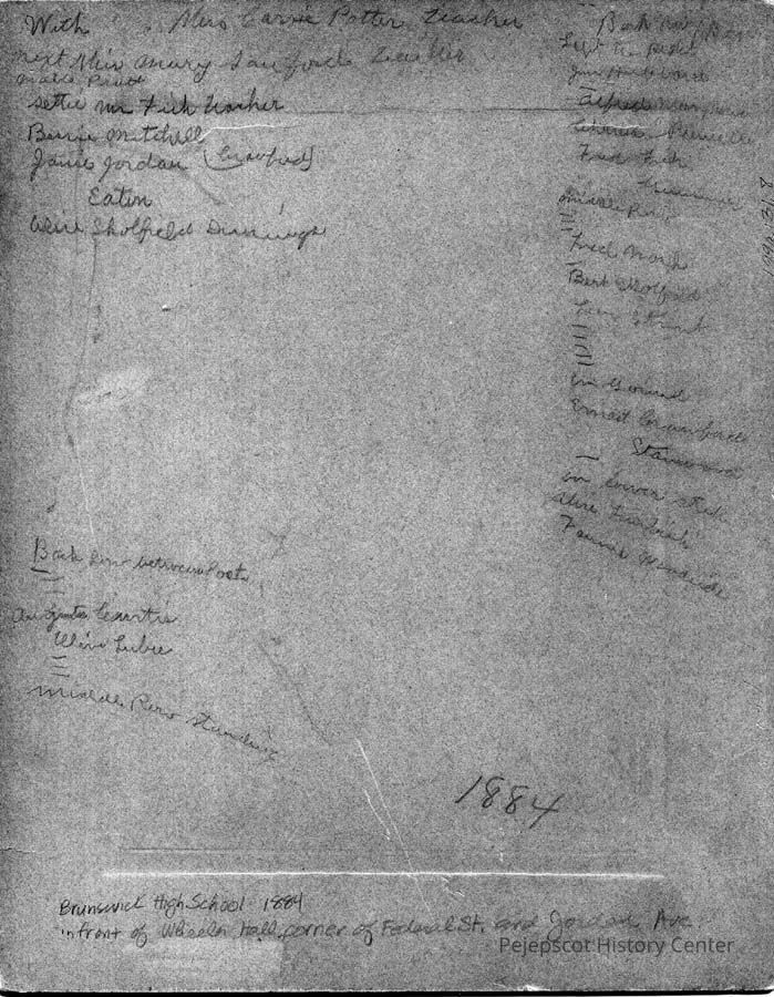 A B/W photograph of students from Brunswick High School 1884 standing in front of Wheeler Hall (Church of Christ) on the corner of Jordan Avenue and Federal Street. Some names are on the back. Barely legible. 1884.