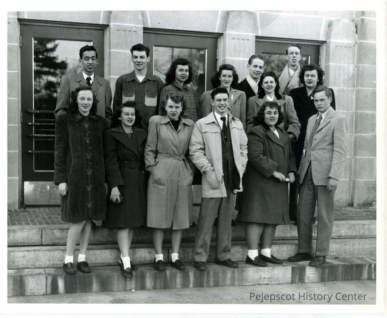 A group photo of eight girls and six boys standing on the steps of Brunswick High School. Undated