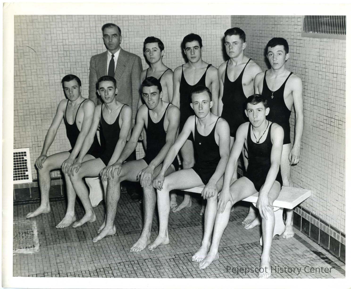 Brunswick High School swim team in 1947. Front row; Darrell Lee, Donald Lincoln, Rene Belanger, Norbert Rose, Paul St. Pierre. Second row; Mr. Crimmins, advisor, Ronald Therriault, George Brassard, Charles Given, Sam Bernier, manager. UndatedLexicon
