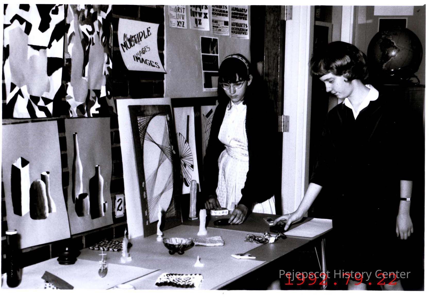 A classic part of art education is showing off work completed throughout the year and seeing the progress made. These art displays are a staple of art education, from elementary to college-level courses. Pictured here is Mary Ganske’s class display table at Brunswick Junior High, Brunswick, ME. Two students, Linda Dione and Diane Bailey, look down at the objects on the table, which include ceramics, textiles, and pieces of metalwork, while the walls are lined in still life and abstract paintings.