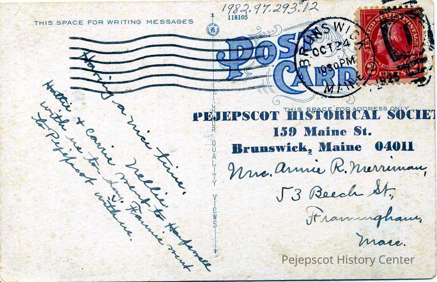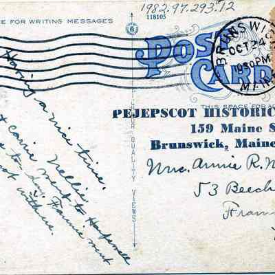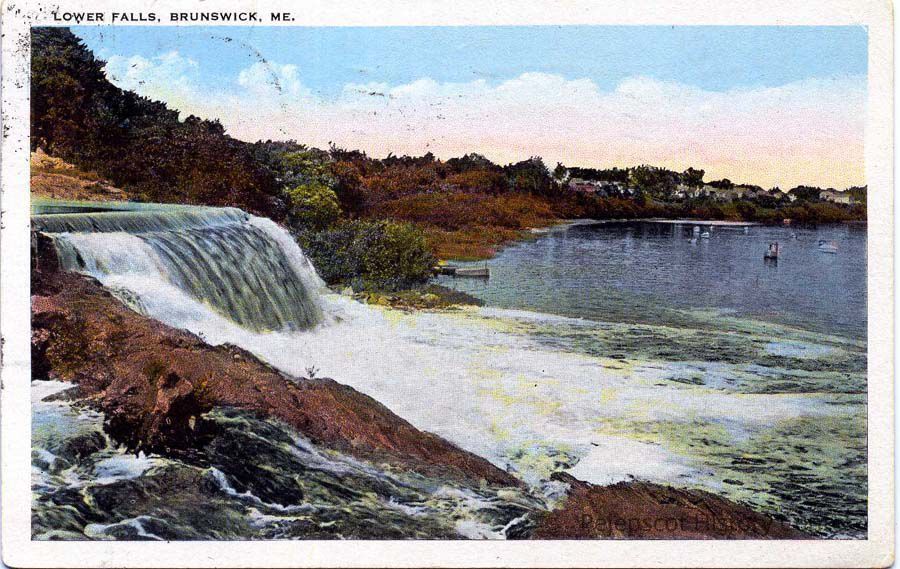 Color postcard of the Lower Falls of the Androscoggin River in Brunswick. Sent to Mrs. Annie R. Merriman, 53 Beech St., Framingham, Mass. Postmarked Brunswick, Maine, Oct. 25, 1925.