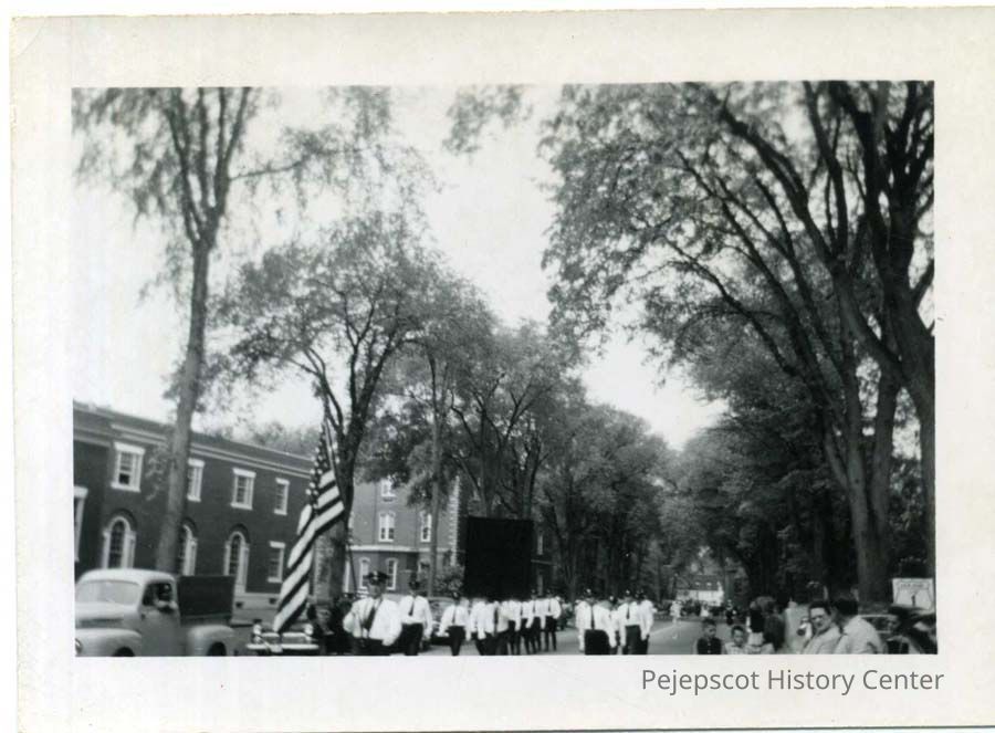 An undated black and white photograph of a group of Brunswick, Maine, men identified as firemen marching in a parade.
