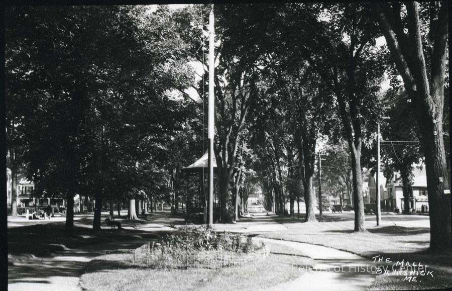 A B/W photograph of a gazebo on the Brunswick Mall, Brunswick, ME. The photo is taken looking south. At that time the bandstand was at the north end of the Mall. Dated 08/05/1931.