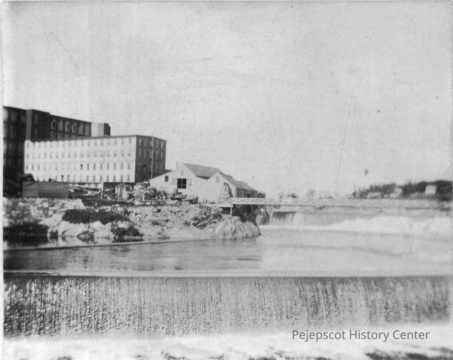 B/W photo of the falls at Brunswick, ME, near Cabot Mill and Scribner Grist Mill. 6/27/1896.