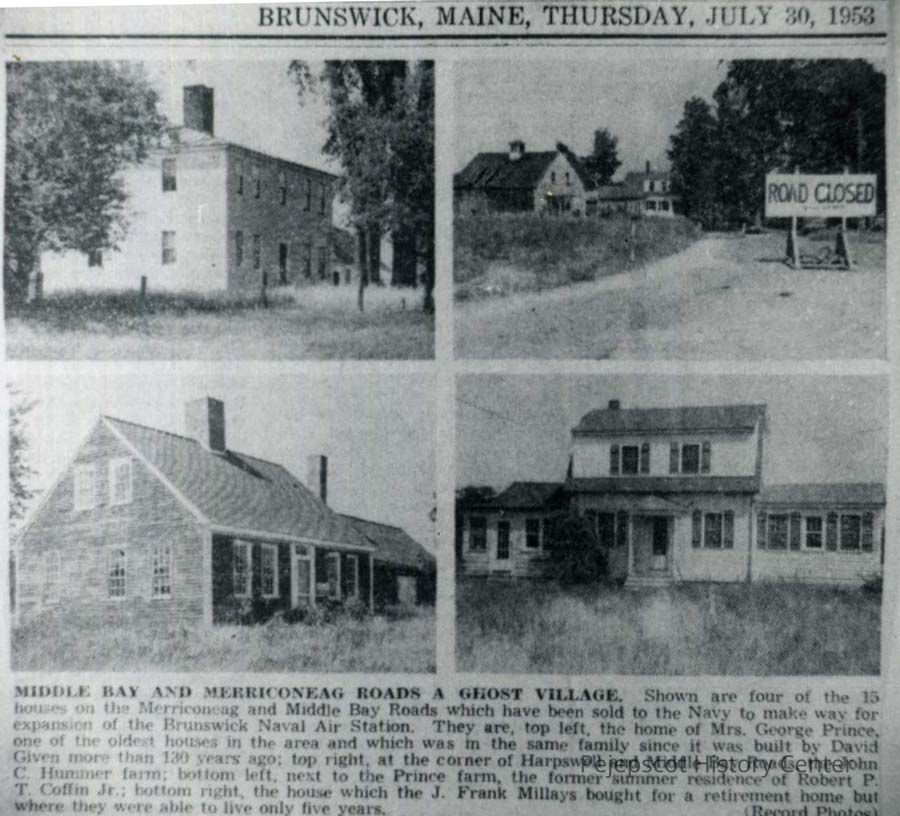 B/W photo of Brunswick Record clipping of four homes sold to the Navy for the expansion of the Brunswick Naval Air Station, Brunswick, ME. 7/30/1953.