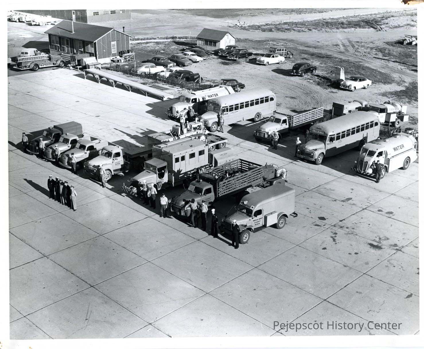 Brunswick Naval Air Station firefighting equipment in October, 1953. Sailors, standing at ease, and civilians stand by each vehicle.