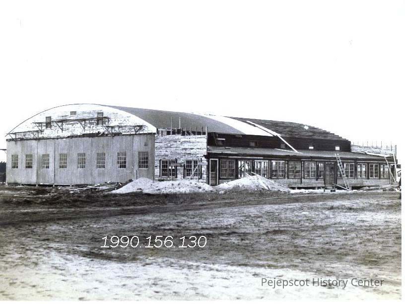 B/W photo of a hangar in the process of being built at the Brunswick Naval Air Station. The Brunswick Naval Air Station (BNAS) was commissioned on April 15, 1943. The Navy's initial intention was to use the base as a location to train Royal Canadian Air Force pilots of the British Naval Command in formation flying, gunnery procedures, and carrier landings. Use of the Navy Base quickly included American pilots during World War II and after to search the Atlantic Ocean for enemy submarines and ships, as well as rescue missions. The Base was deactivated in 1947 with the close of World War II, but was quickly reactivated in 1951 for the start of the Cold War. Undated.Collection