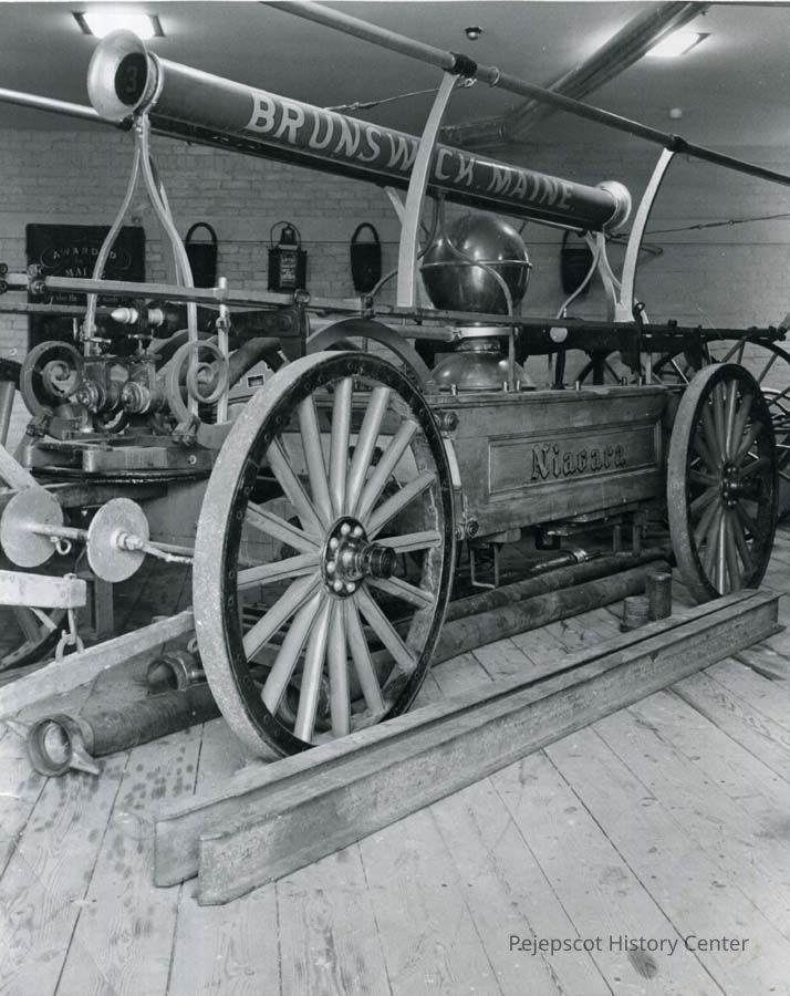 A B/W photograph of the Brunswick Niagara 3 firetruck. Rebuilt in part by Louis C. Bernier. The vehicle is inside a building.