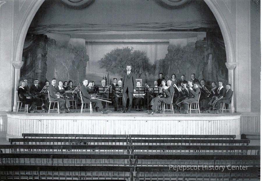 A B/W photo of the Brunswick Orchestral Society Junior Orchestra on the Town Hall stage. 1/26/1921