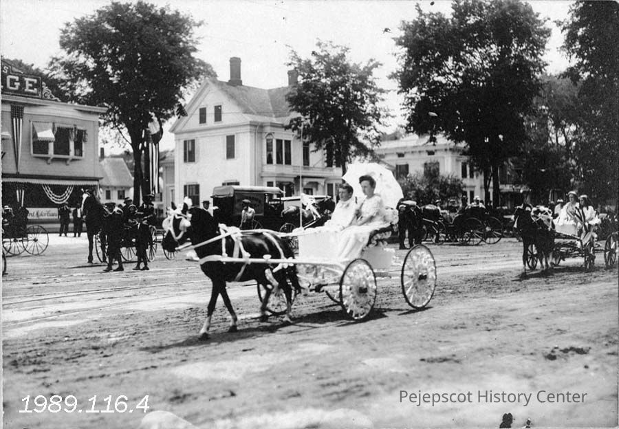 Gladys Walker and her cousin, Hartley Strout, in a parade in Brunswick at the corner of School and Maine streets. c. 1915.