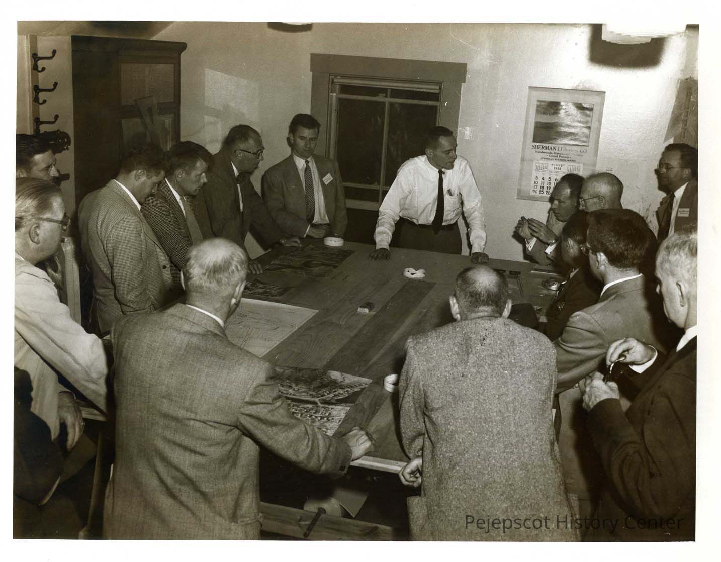 This could be a meeting of the planning board with fourteen men standing around a table looking at a map and aeriel view of Brunswick. Burt Whitman is on the far right. Undated