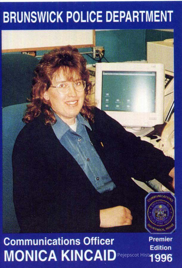 Color souvenir card of Communications Officer Monica Kincaid, Brunswick, ME, Police Department. On the back is a brief biography and safety message. 1996.