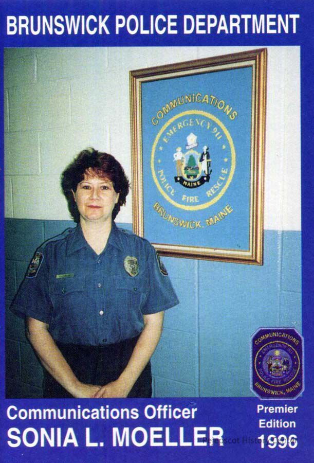Color souvenir card of Communications Officer Sonia L. Moeller, Brunswick, ME, Police Department. On the back is a brief biography and safety message. 1996.