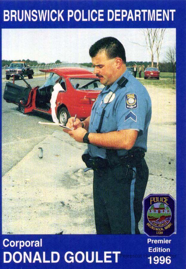 Color souvenir card of Corporal Donald Goulet, Brunswick Police Department. On the back is a brief biography and safety message. 1996.