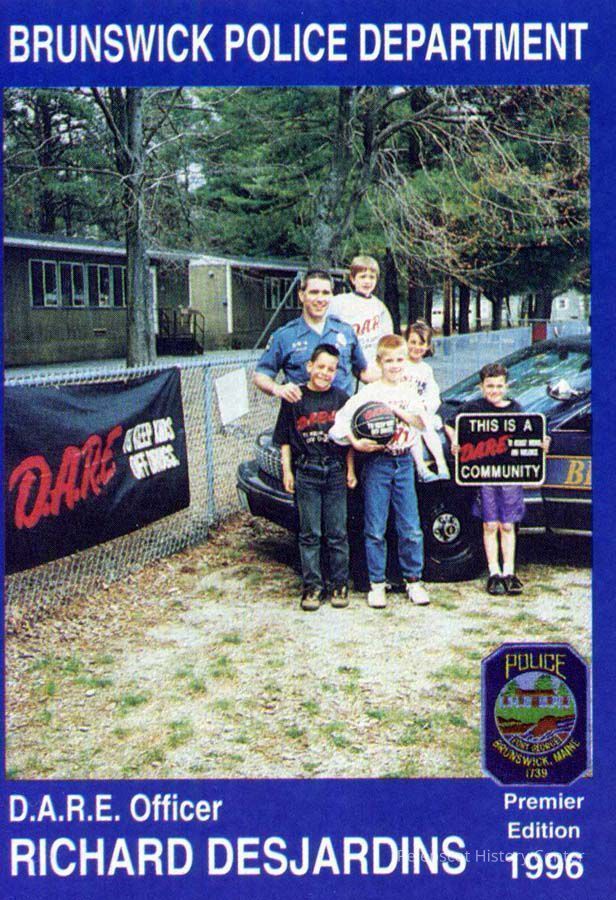 Color souvenir card of D.A.R.E Officer Richard Desjardins, Brunswick, ME, Police Department. On the back is a brief biography and safety message. 1996.