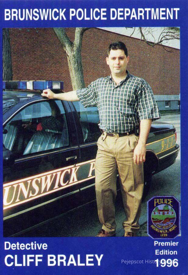 Color souvenir card of Detective Cliff Braley, Brunswick, ME, Police Department. On the back is a brief biography and safety message. 1996.