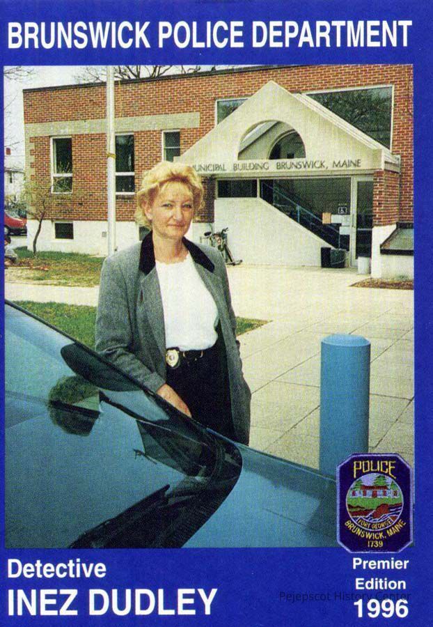 Color souvenir card of Detective Inez Dudley, Brunswick, ME, Police Department. On the back is a brief biography and safety message. 1996.