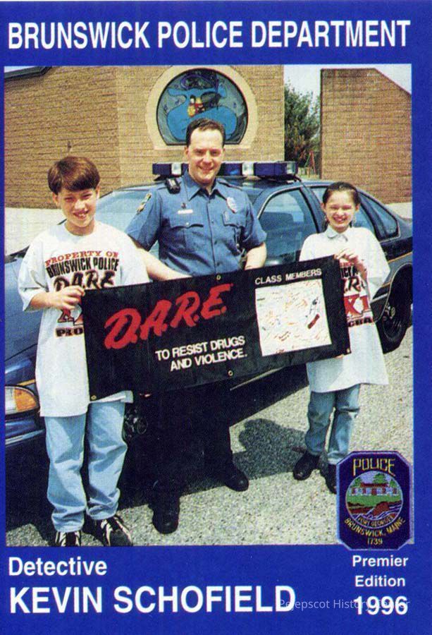 Color souvenir card of Detective Kevin Schofield, Brunswick, ME, Police Department. On the back is a brief biography and safety message. 1996.