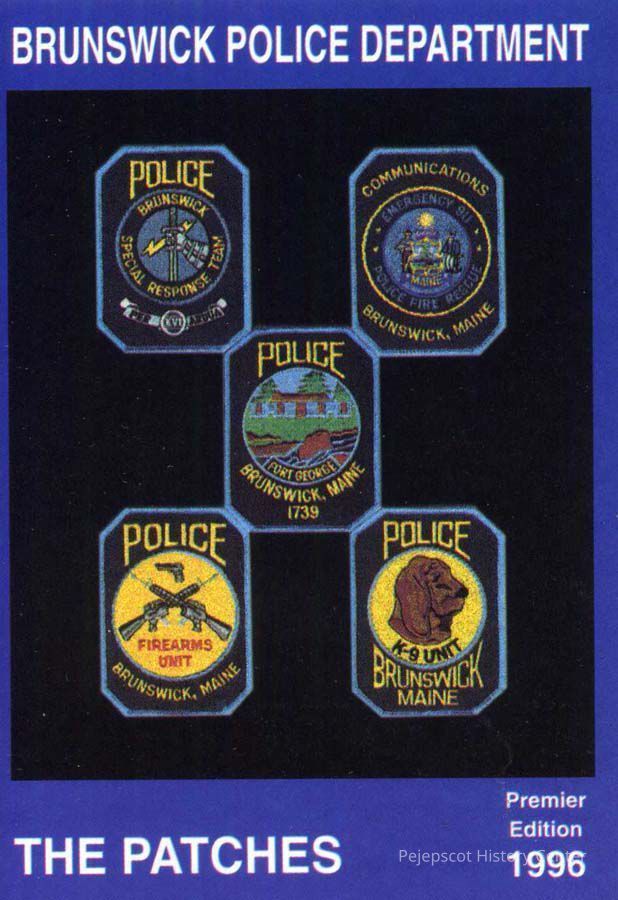Color souvenir card with 5 Brunswick Police Department patches, Brunswick, ME. On the back is a brief safety message. 1996.