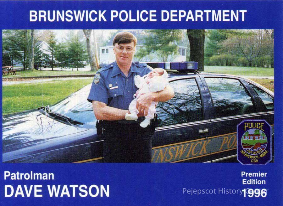 Color souvenir card of Patrolman Dave Watson and unknown infant, Brunswick, ME, Police Department. On the back is a brief biography and safety message. 1996.