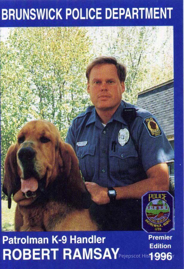 Color souvenir card of Patrolman (K-9 Handler) Robert Ramsay, Brunswick, ME, Police Department. On the back is a brief biography and safety message. 1996.