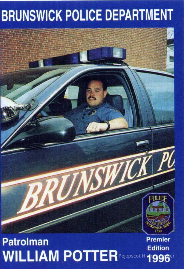 Color souvenir card of Patrolman William Potter, Brunswick, ME, Police Department. On the back is a brief biography and safety message. 1996.
