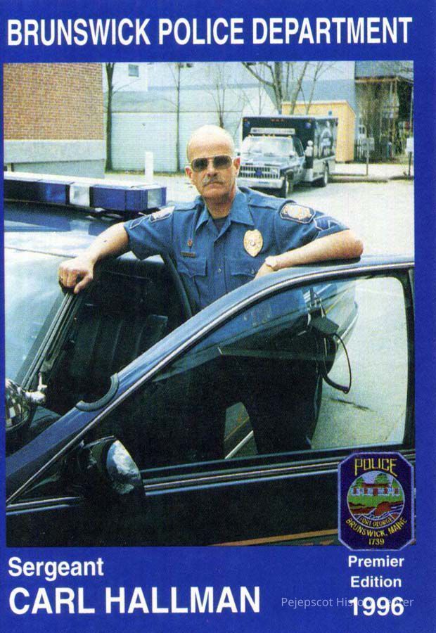 Color souvenir card of Sergeant Carl Hallman, Brunswick, ME, Police Department. On the back is a brief biography and safety message. 1996.