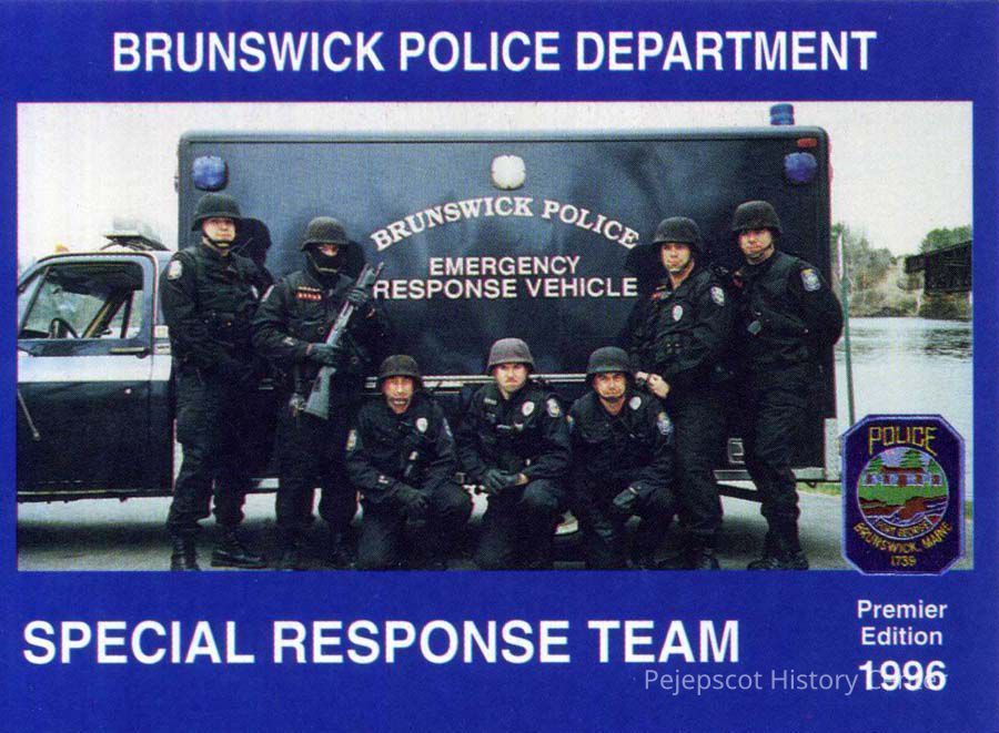 Color souvenir card of Special Response Team, Brunswick, ME, Police Department. On the back are brief biographies and safety message. 1996.
