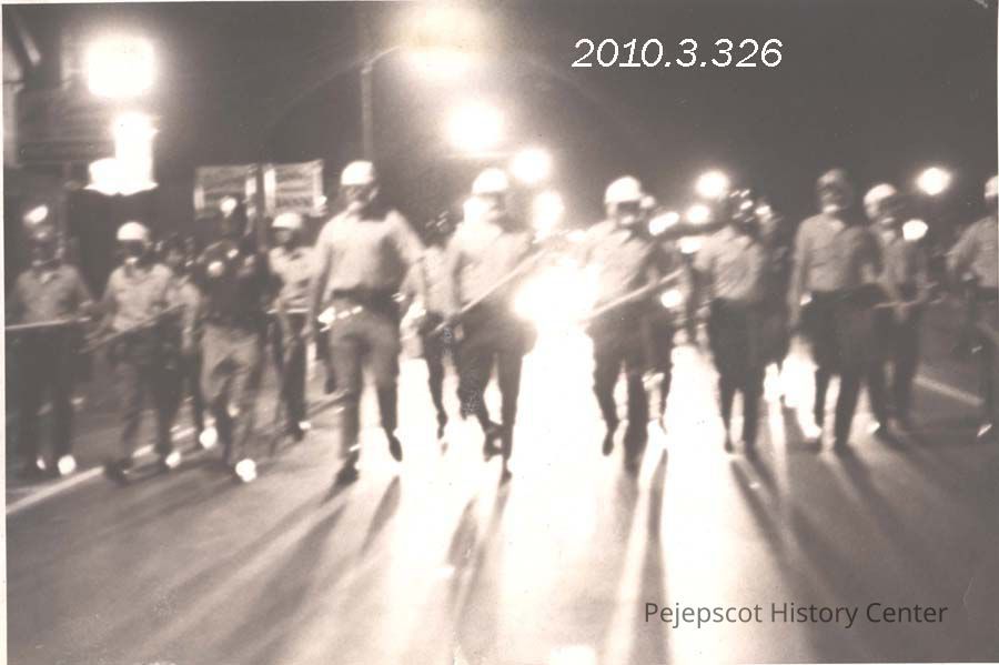 Note from Steve McCausland, former spokesperson for Maine Department of Public Safety: "July of 1970. The crowd of 200 were protesting a local ordinance, enacted by the town council, that prohibited the playing of football and frisbees on the downtown mall. That ordinance was later repealed. Although the protests took place during the height of Vietnam War unrest, the Brunswick incident had nothing to do with that conflict."Collection