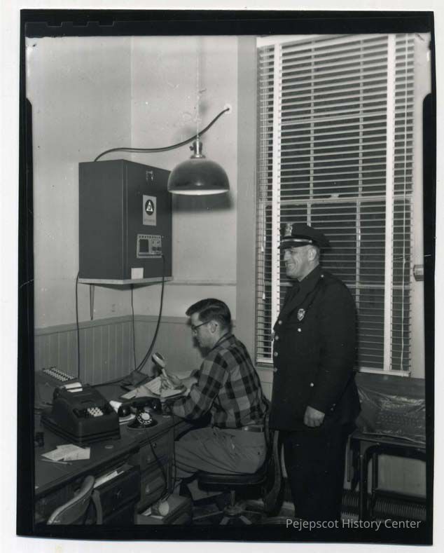 A dispatcher sits at a desk while a police officer stands behind him. The police department was located in the old town hall on Maine Street at the time.