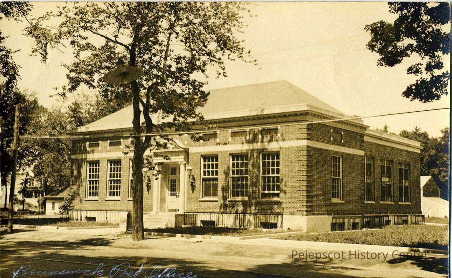 A sepia postcard of the Brunswick Post Office, 28-30 Pleasant St. Brunswick, Maine. Undated.